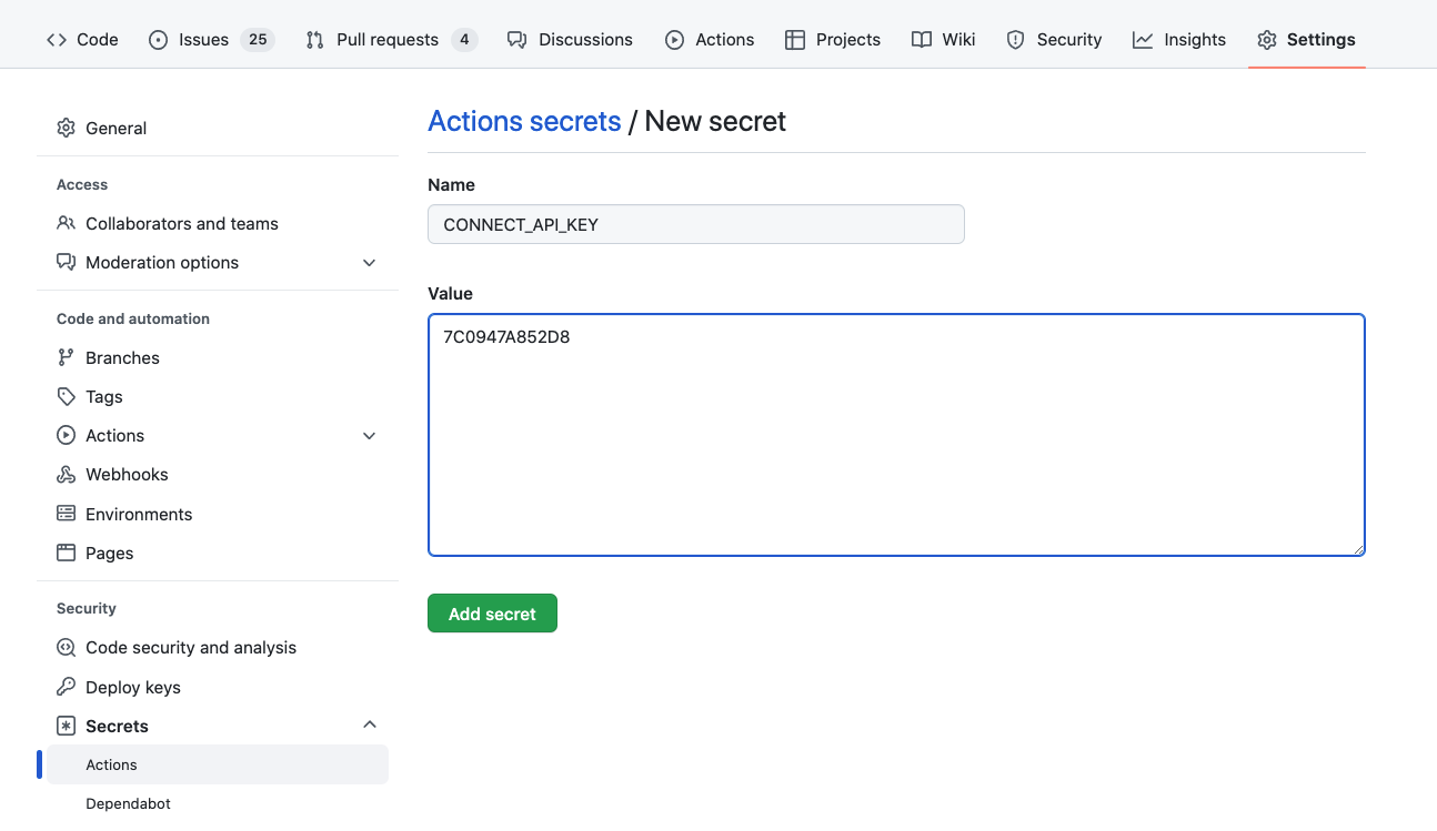 Click the button and add the API Key from step 1 as a secret named CONNECT_API_KEY: